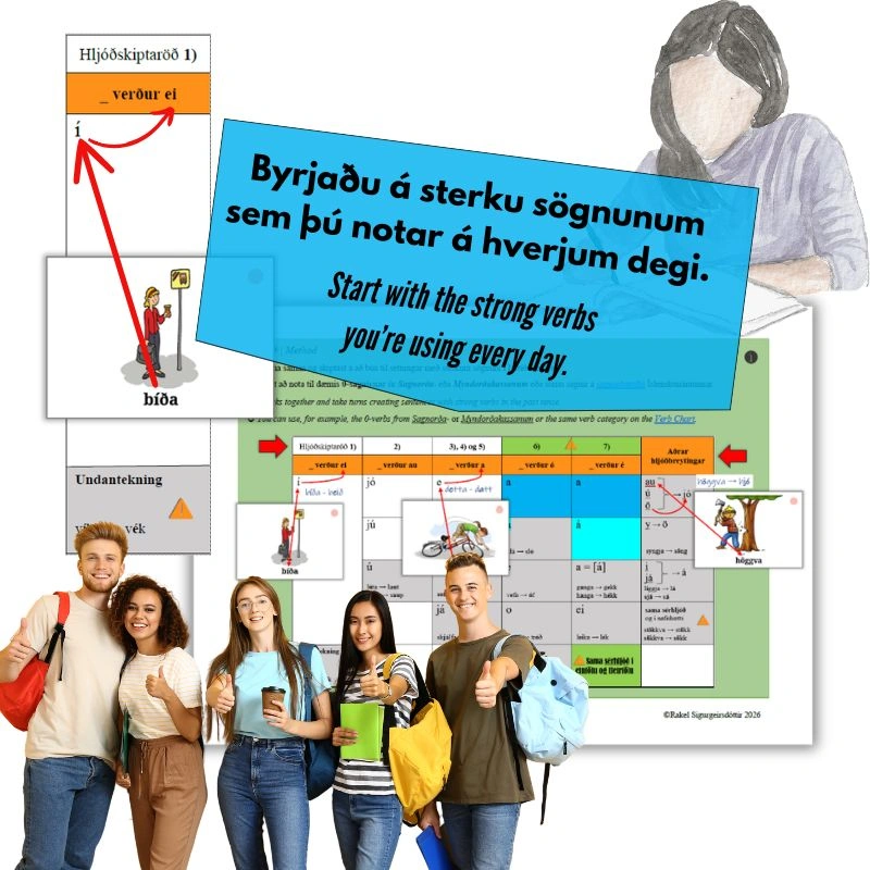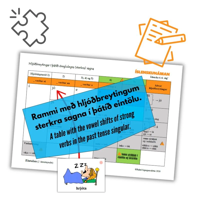 Efni: Rammi yfir hljóðbreytingar sterkra (óreglulegra) sagna í þátíð eintölu.